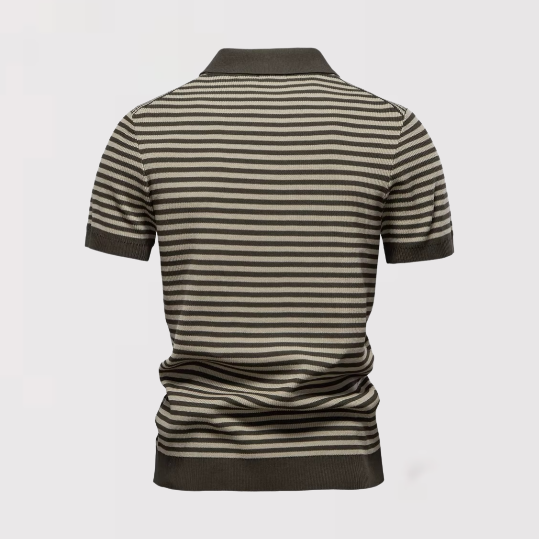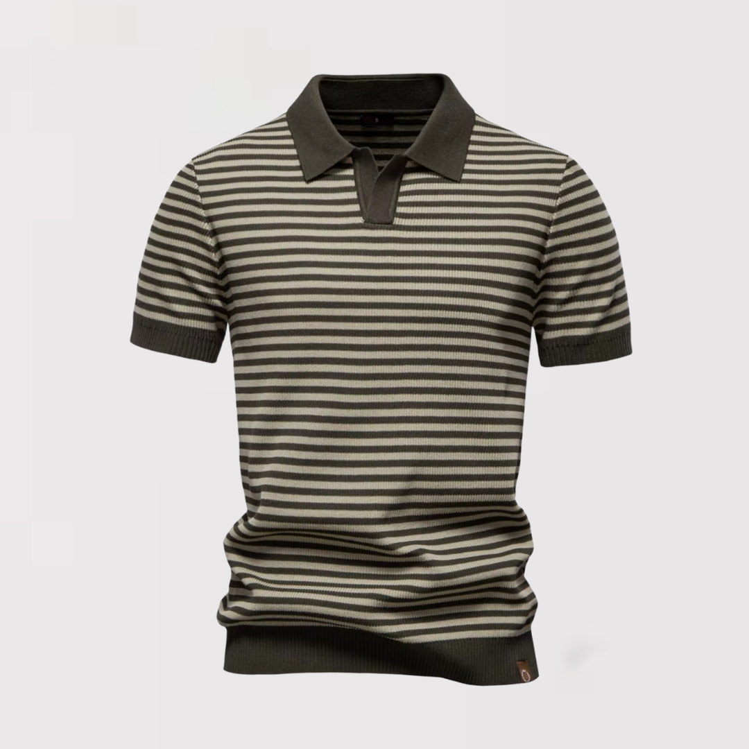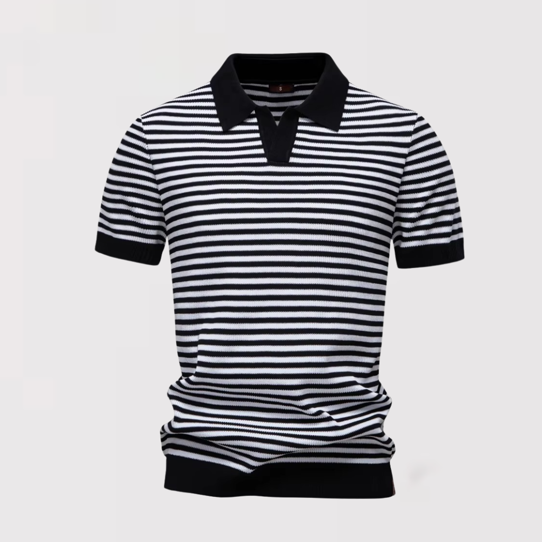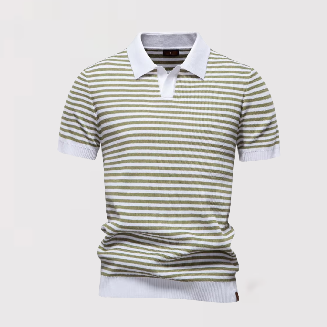爽やかなボーダーデザインが目を引く、ボタンなしのストライプポロシャツ。