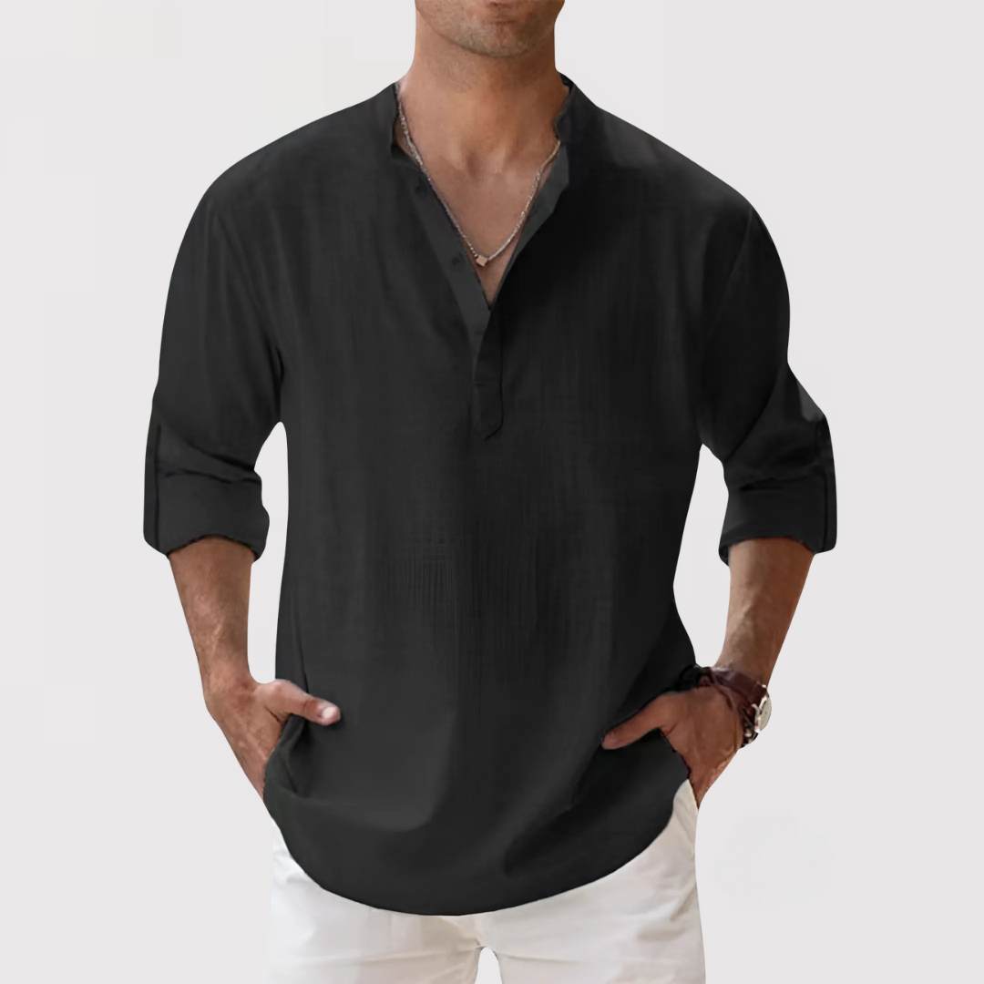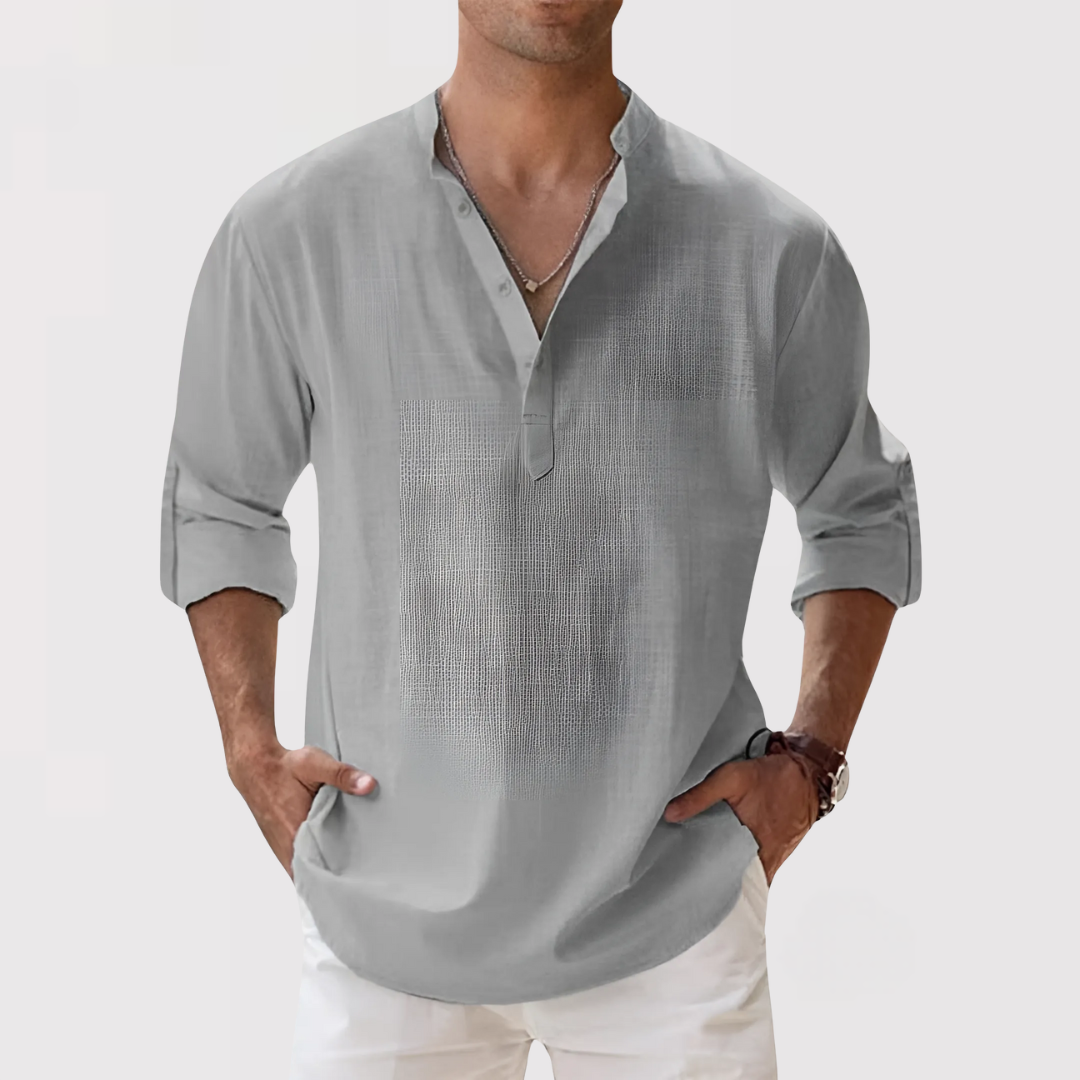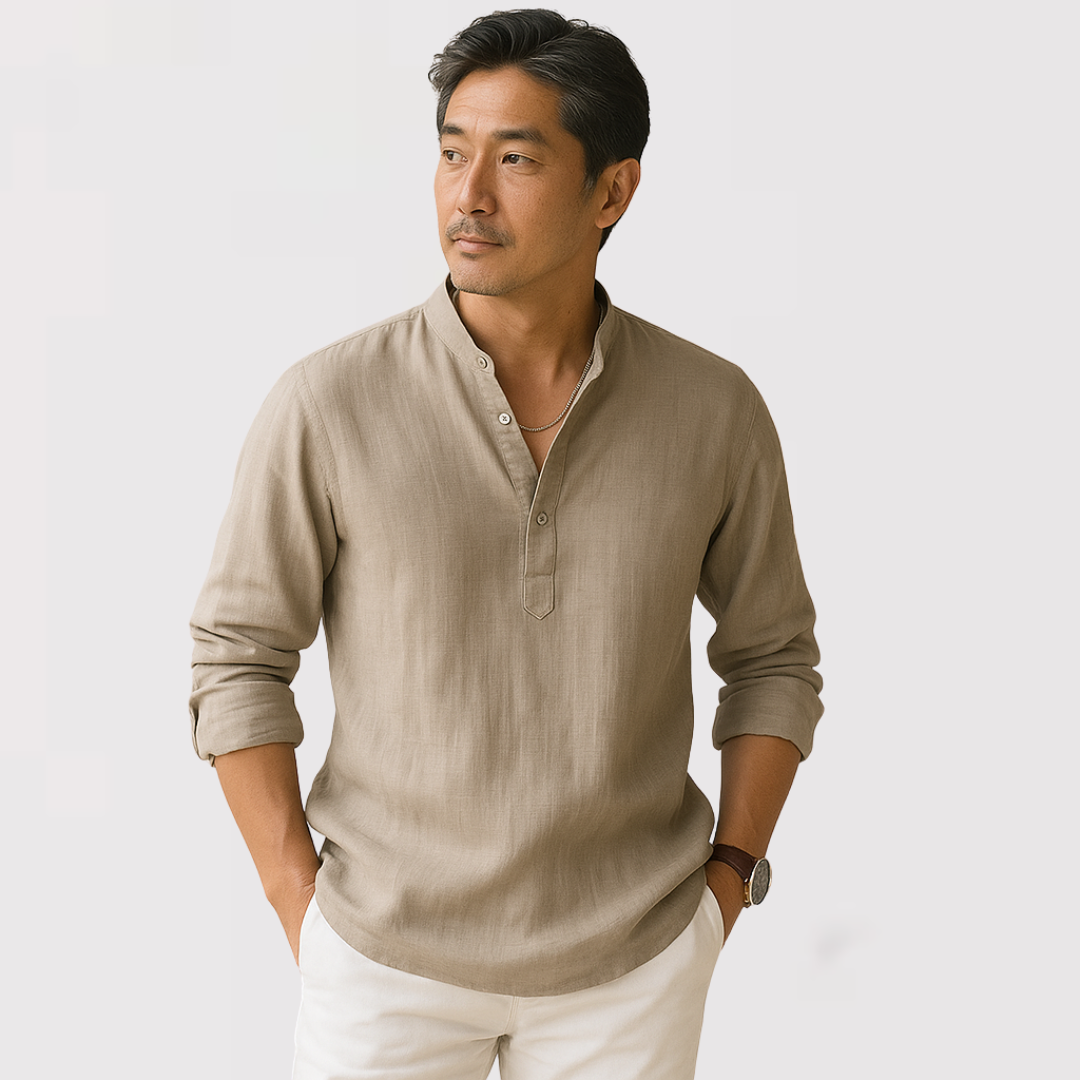快適さとスタイルを両立したコットン素材のヘンリーネックシャツ。程よい立体感のある生地で、カジュアルにも上品にも使えます。