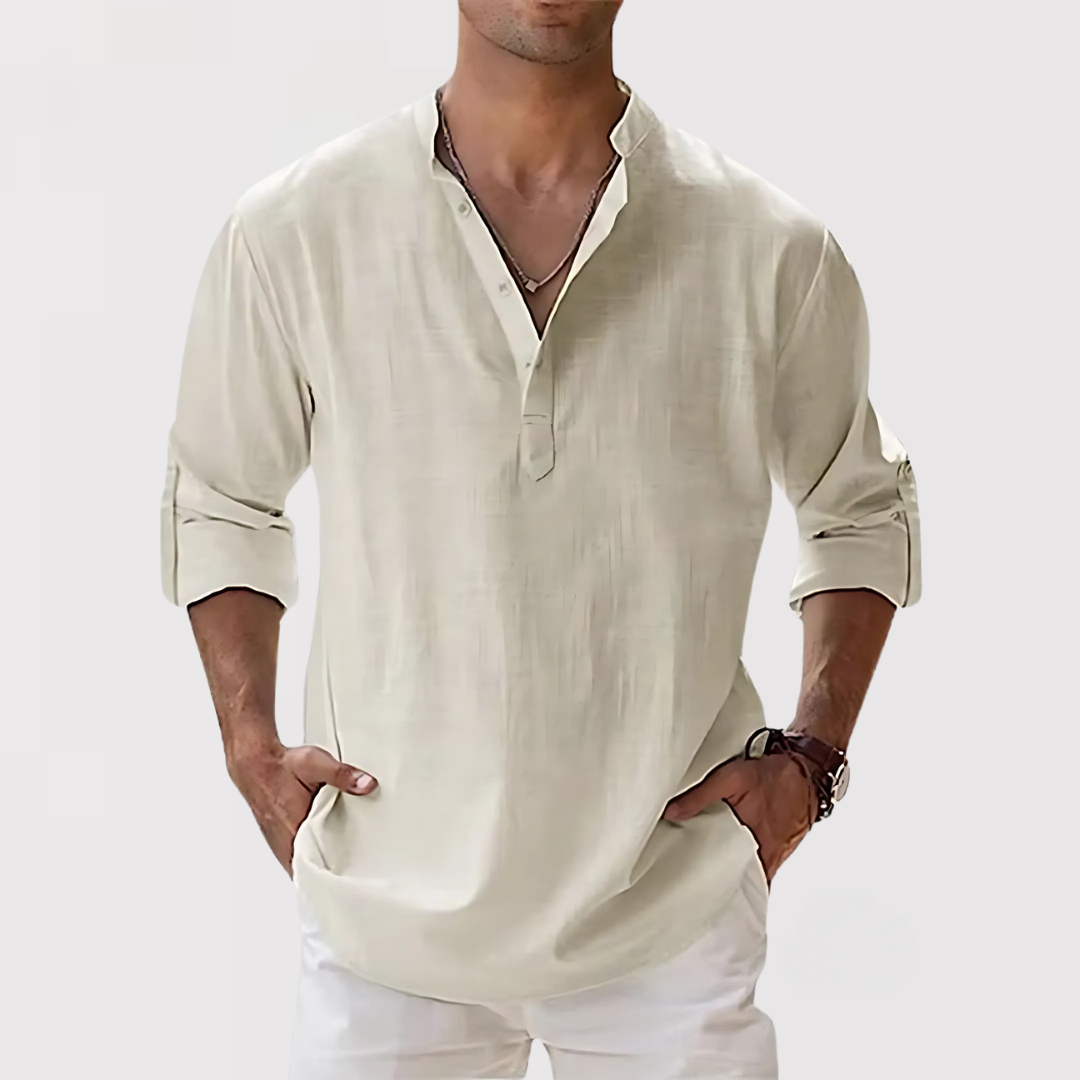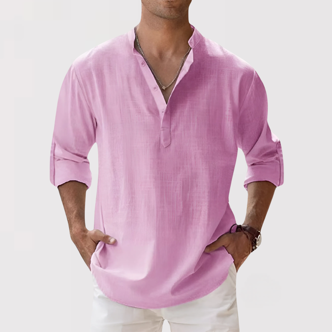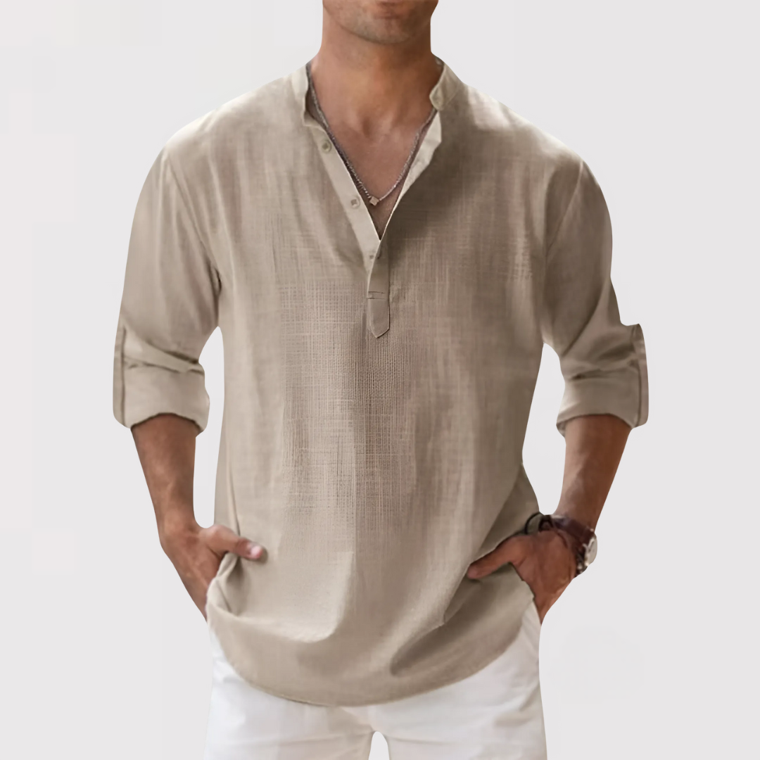 快適さとスタイルを両立したコットン素材のヘンリーネックシャツ。程よい立体感のある生地で、カジュアルにも上品にも使えます。