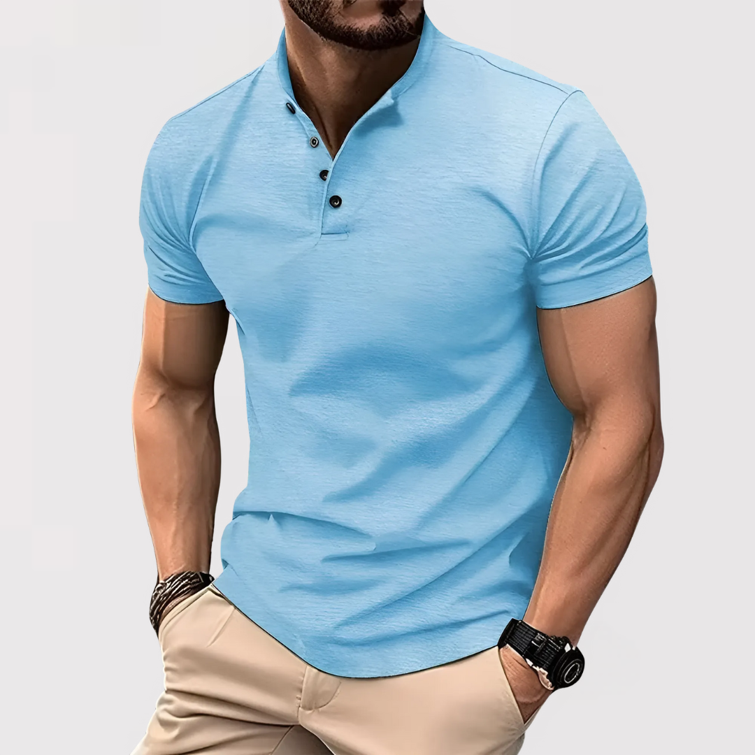 ディテール: ヘンリー型ボタン、ポロカラー、柔らかく通気性のある生地